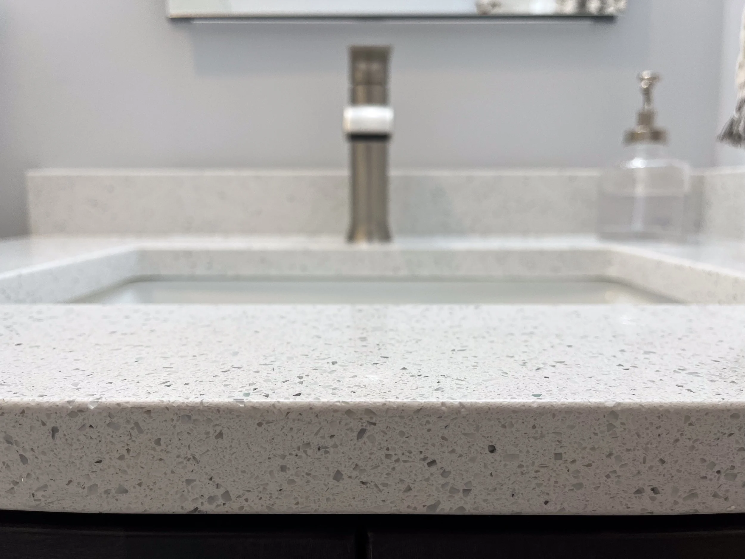 This bathroom looks so much bigger and brighter with the glass enclosure that allows the outside light into the room. We used 3 separate tile designs in the shower—black hex on the floor, white subway on the walls, and the shower niche is a pattern tile. All of the tile choices tie the design together and have a classic but modern look. To further tie the bathroom design together, we used matching quartz countertops and accent pieces in the shower (threshold, half wall cap & niche shelves). The small details make a big difference in the final result.